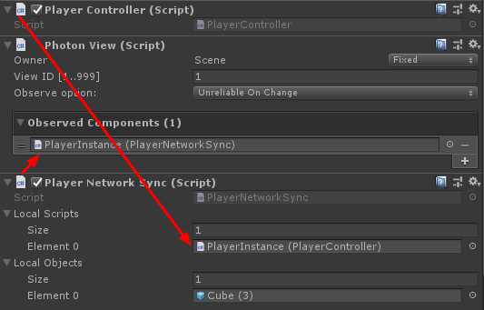 }- Add the PlayerNetworkSync.cs script to the PlayerInstance and assign it to the PhotonView Observed Components.