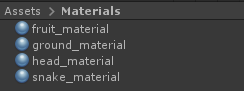 - Now for the materials, create 4 materials (Right Click -> Create -> Material) and name them respectively "ground_material", "snake_material", "head_material" and "fruit_material":