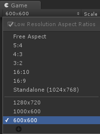 - Change the Game view resolution so the width and height are equal (ex. 600px x 600px)