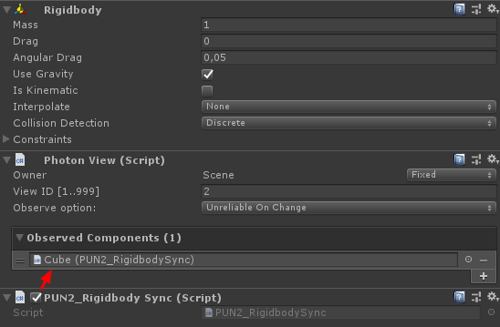}- Attach PUN2_RigidbodySync to both Cubes and also assign it to Photon View "Observed Components":