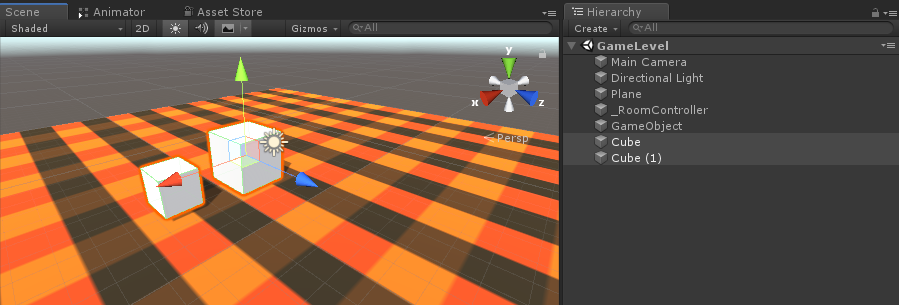- Open the "GameLevel" Scene and create a couple of Cubes (GameObject -> 3D Object -> Cube)