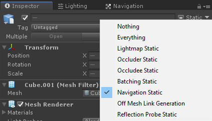 - Select all the Scene Objects that will be static (Ex. Terrain, Trees, etc.) and Mark them as "Navigation Static":
