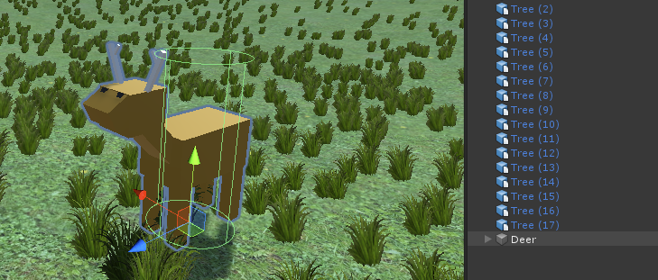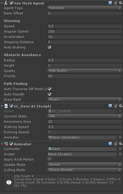 }- Place the Deer model in the Scene and attach a NavMesh Agent, SC_DeerAI script, and Animator component to it: