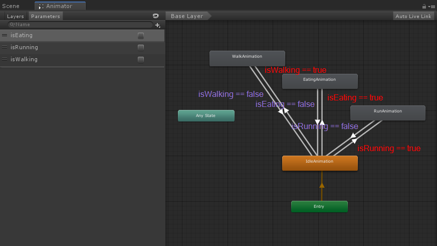 }(Each State initializes the values and the NavMesh Agent target for the next state. For example, the Idle state has 2 possible outcomes, it either initializes the Running state if the enemy is present or the Eating state if no Enemy crossed the awareness area.
