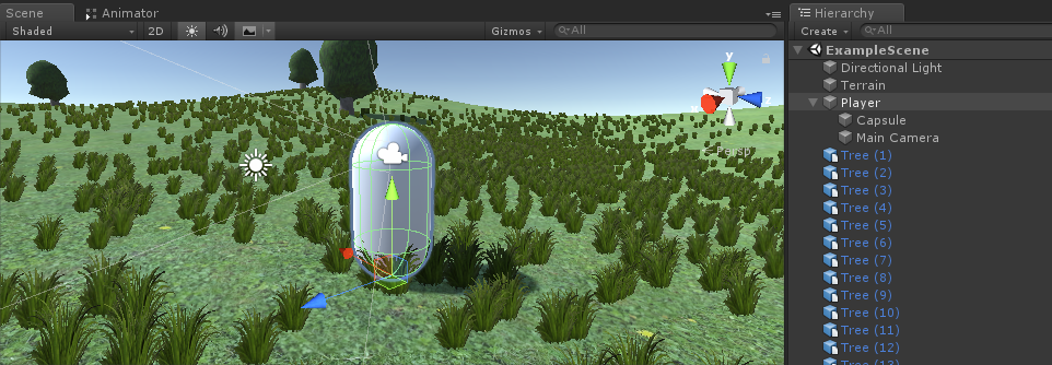 - Create a new Capsule (GameObject -> 3D Object -> Capsule), then make it a child object of the "Player" Object, change its position to (0, 1, 0), and remove its CapsuleCollider component.