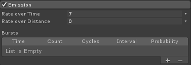 - In Particle System enable these modules: Emission, Shape, Velocity over Lifetime, Color over Lifetime, Size over Lifetime, Rotation over Lifetime, External Forces, Renderer.